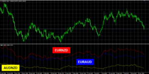 あまり馴染みがないかもしれませんが、無茶なロットを張らなければまず勝てますので、興味のある方はデモ口座等ででもお試しください。皆さんご存知の万年レンジ相場のAUDNZDをユーロ視点からアプローチします。下のチャートは、この3通貨の相関を表示するインジケーターを作成して表示しています。(日足で表示してます)